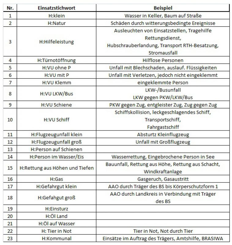 Welche möglichen Einsätze hinter den jeweiligen Stichwörtern stehen, ist aus den beigefügten